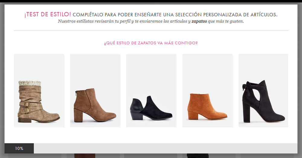 ¿Podemos hacer lo mismo con los formularios? ¡Por supuesto! Podemos hacer todo si nos lo proponemos aunque sea una tarea complicada. Un ejemplo que suelo poner es el formulario de registro de JustFab. Te lo presentan como un quiz, un test de estilo. Te van presentando diferentes zapatos, celebrities y estilos y has de seleccionar los que más te gustan. Al final del proceso te piden algunos datos más personales, como fecha de nacimiento, tallas, etc, pero como ya estás en modo disfrute no te da tanto palo. Bueno, eso supongo porque yo no soy el target 😛 (intenta ponerte siempre en la piel de tu target)