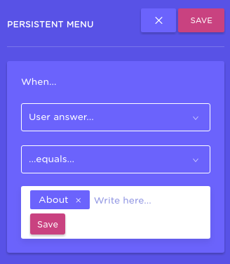 Este sirve para tener un menú dónde el usuario puede hacer click. Por cada opción hemos de tener un menú y lo que verá el usuario será los bloques que pongas a continuación de cada persistent menu.