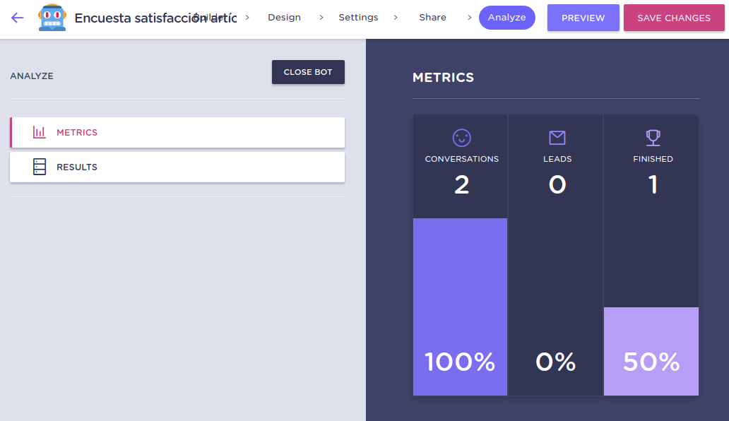 Justo donde pone New bot podemos hacer click y cambiar el nombre. En mi caso le he puesto «Encuesta satisfacción».