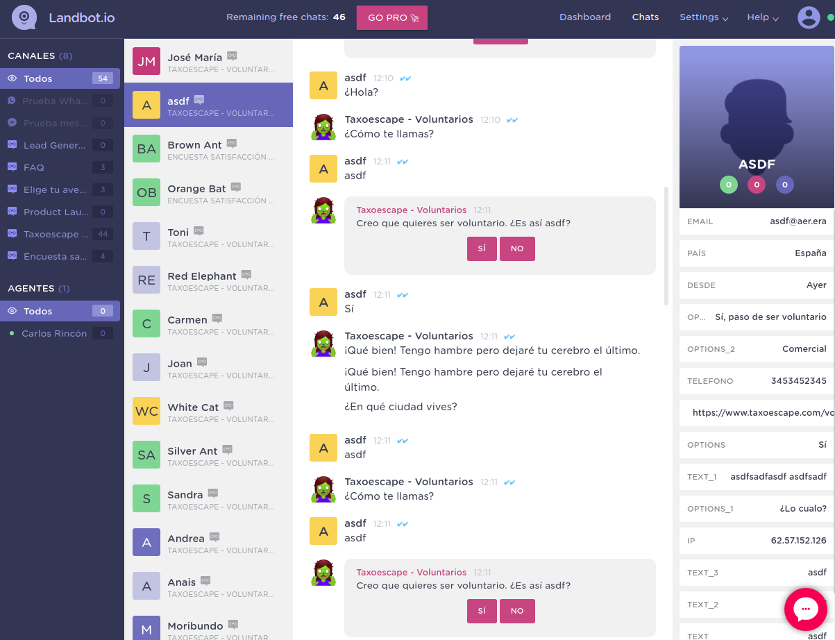 Desde la página principal hay un enlace que nos lleva a la pantalla de chats. Allí podemos ver las conversaciones con cada uno de nuestros usuarios. Los pasos que han dado y lo que han respondido.