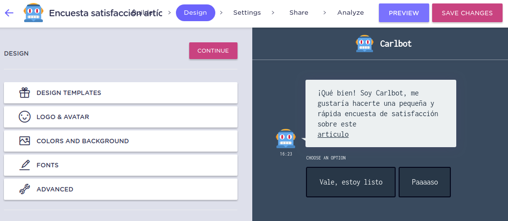 En este apartado podemos configurar el diseño. Usar unos templates predefinidos, los colores de todo, la imagen del bot, las fuentes e incluso javascript y css personalizado.