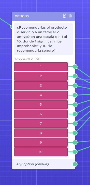 Para el NPS he usado también un bloque de pregunta de tipo botón ya que no hay uno que se ajuste más. Seguramente no es lo ideal pero para este ejemplo nos sirve. Hay que poner como opciones los números del 1 al 10.