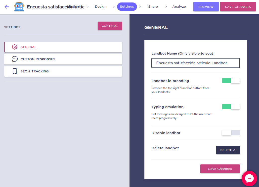Aquí podemos quitar el branding de landbot.io (en versiones de pago, no la gratis), si se tarda un poco al mostrar los mensajes emulando a una persona, traducir los mensajes del interfaz a nuestro idioma e incluso algunas cosas de SEO y poder poner nuestro código de seguimiento de analytics.