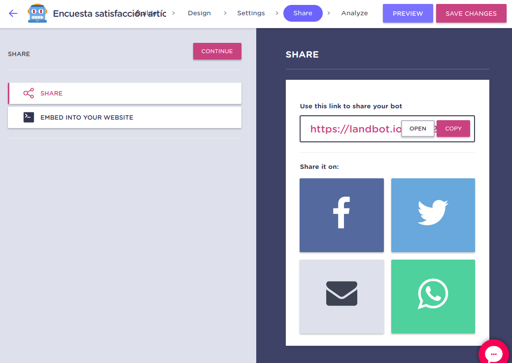 Aquí podemos obtener en enlace para acceder a nuestro landbot o el código para incrustarlo en nuestra web.