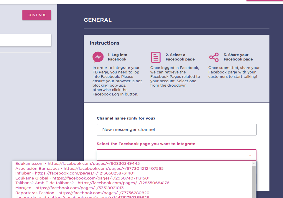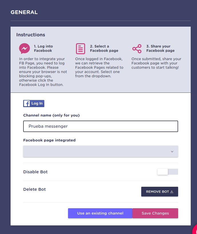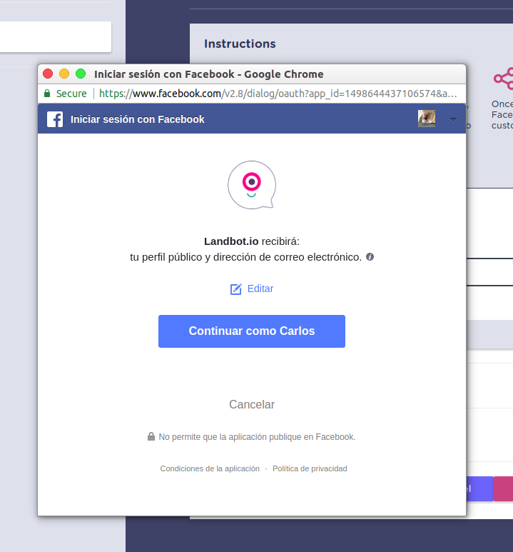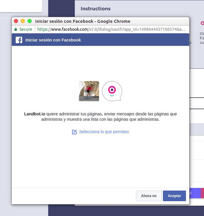 Ahí has de hacer click en Log In de facebook para autorizar a Landbot los permisos necesarios para gestionar los mensajes de tus páginas.
